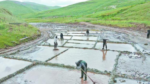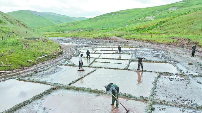 牧民用木质耙子收集红盐。