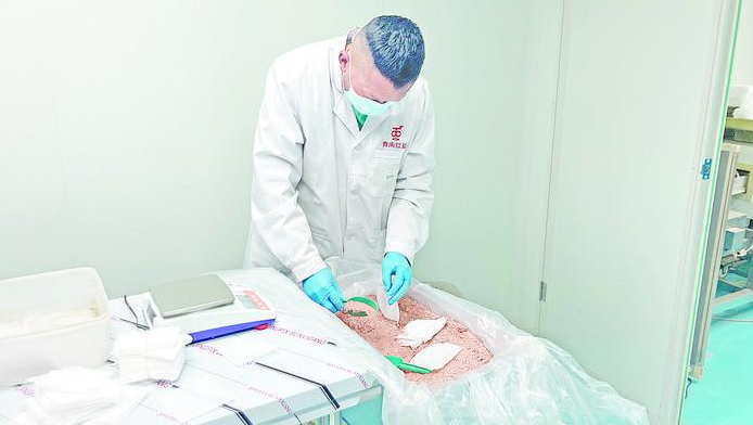 粒粒透过布袋缝隙,看到中药、碳纤维电热管、发热体基材等也被装在布袋中。接着,另外一个人开始封口,第三个人在白色布袋外层再加缝一层印着“青南红盐”的蓝色布料,并装进“青南红盐热敷袋”的包装盒中。