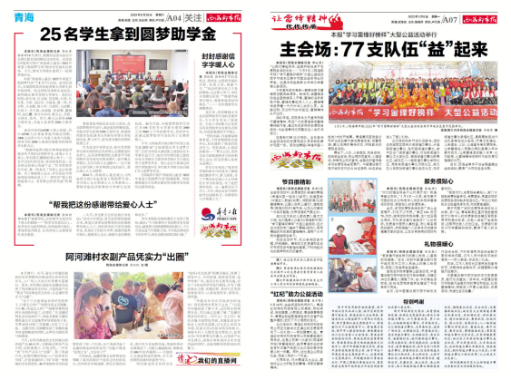 西海都市报社创办《西海公益》栏目,成立西海爱心基金,让公益走向常态化、平民化,成为报纸服务大众、回馈社会的一大品牌,成为传递社会正能量、引领社会新风尚的一大阵地。2023年,西海公益发起“学习雷锋好榜样”、公益植树、正能量奖励、“希望工程”圆梦行动、暖冬行动等10余场公益活动。